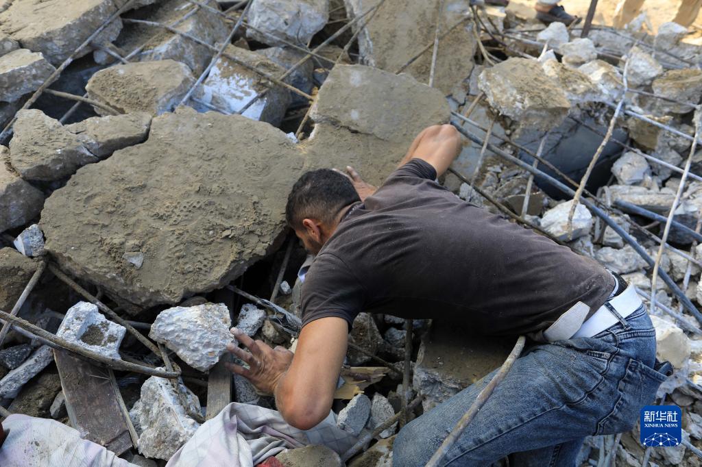 10月16日,在加沙地帶南部城市汗尤尼斯,一名男子在遭以色列襲擊后的建筑廢墟中救援傷者。