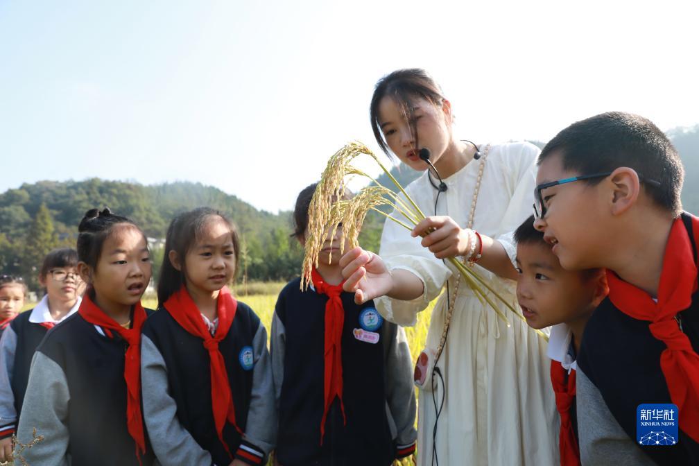 10月16日,浙江省杭州市臨安區天目山鎮藻溪小學(xué)學(xué)生在老師的帶領(lǐng)下學(xué)習水稻知識。