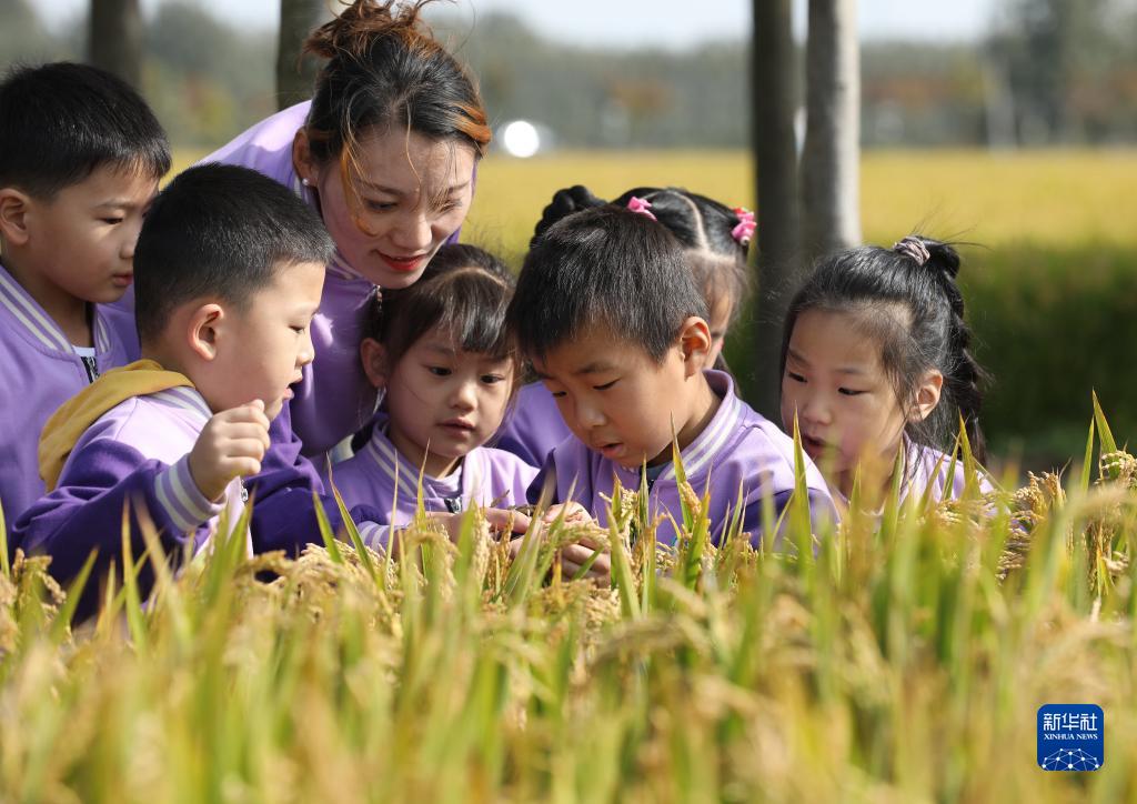 10月16日,山東省臨沂市沂南縣大莊鎮翔宇幼兒園的小朋友在稻田學(xué)習水稻知識。