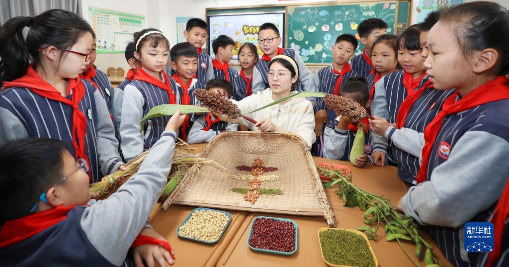 10月16日,江蘇省淮安市生態(tài)文旅區沁春路小學(xué)的老師帶領(lǐng)學(xué)生辨識糧食。