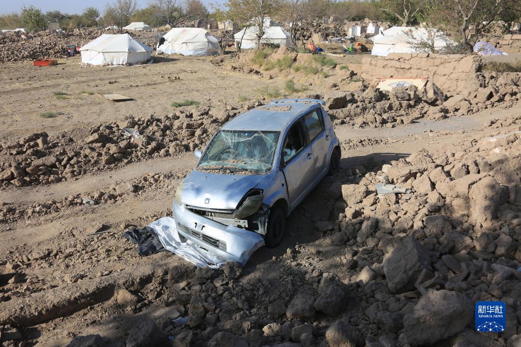 這是10月16日在阿富汗西部赫拉特省拍攝的地震中損毀的汽車(chē)。