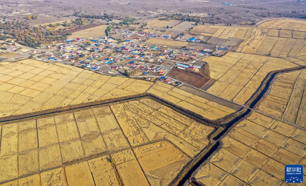 通遼市科爾沁左翼后旗金寶屯鎮套布海村水稻收獲過(guò)半(10月14日攝,無(wú)人機照片)。