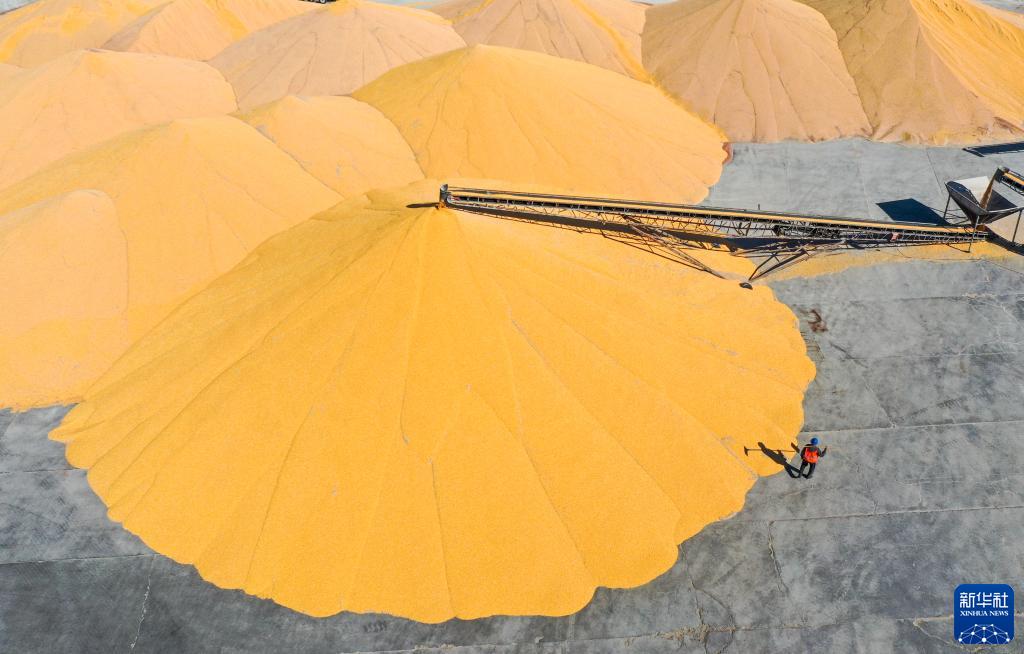 10月15日,通遼市科爾沁左翼中旗腰林毛都鎮收糧站的工人在整理烘干的玉米堆(無(wú)人機照片)。