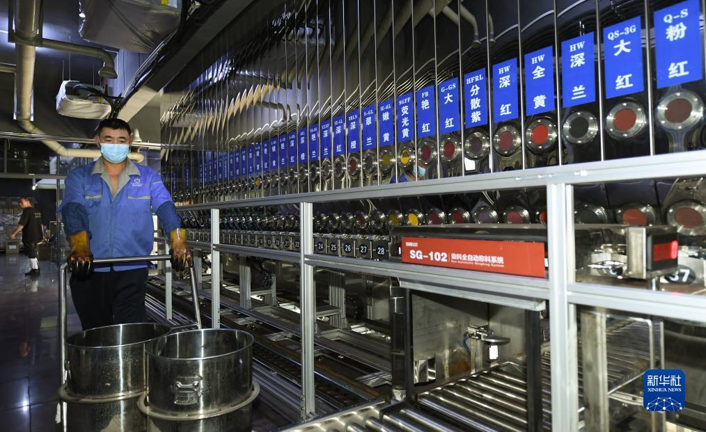 10月17日,浙江鴻大印染集團有限公司的工作人員在染料全自動(dòng)稱(chēng)料車(chē)間工作。