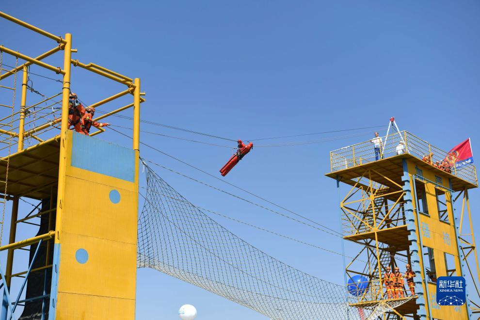 10月17日,參賽隊員在繩索救援項目中比拼。