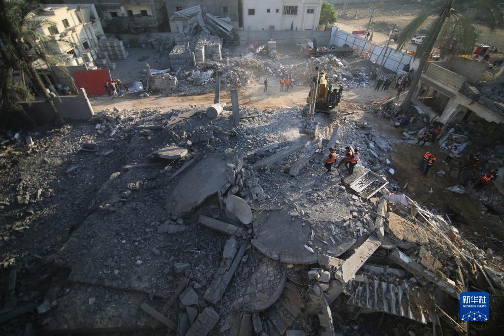 10月16日,在加沙地帶南部城市拉法,人們在遭以色列空襲損毀的建筑廢墟中實(shí)施救援。