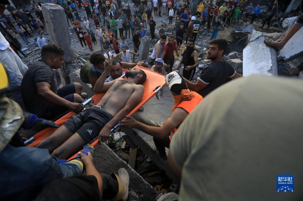 10月17日,在加沙地帶南部城市汗尤尼斯,人們在遭以色列襲擊損毀的建筑中實(shí)施救援。