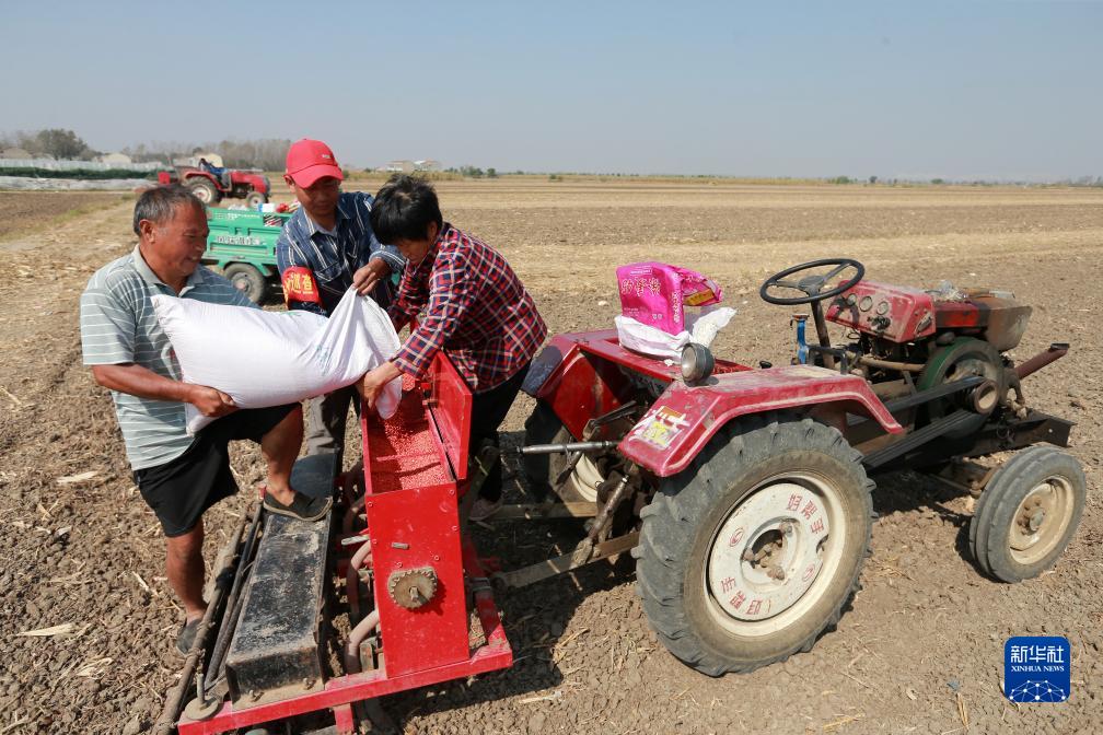 10月17日,在淮北市濉溪縣雙溝村,農民為播種機添加小麥種子。