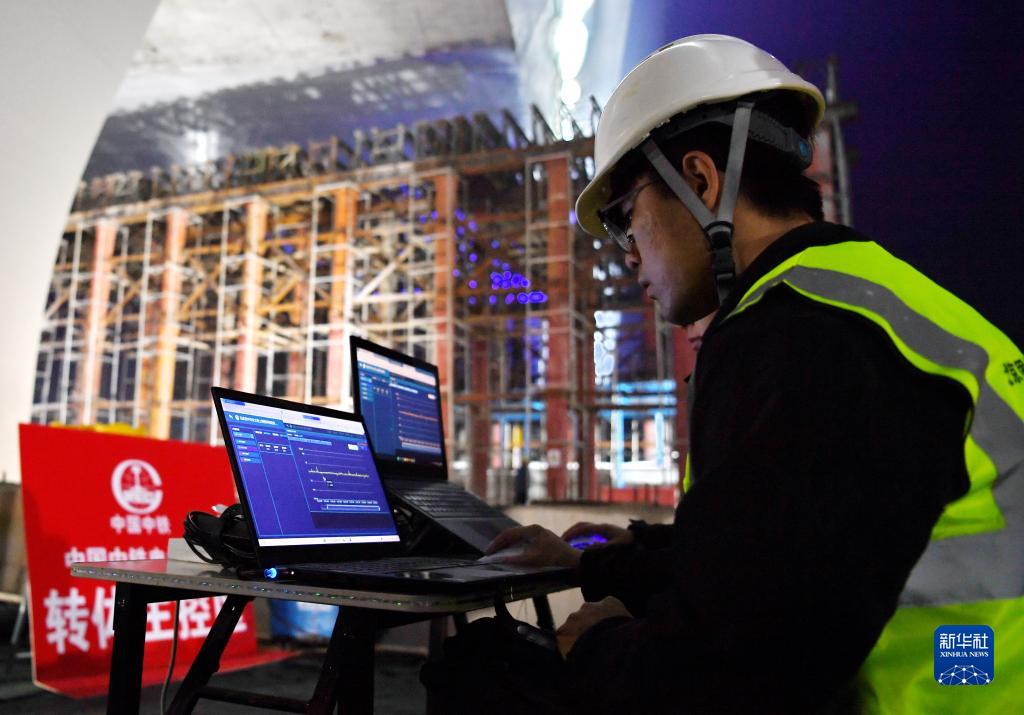 10月18日,施工人員在轉體現場(chǎng)監測相關(guān)數據。