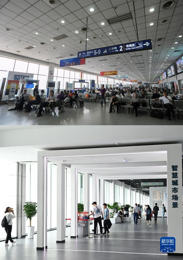 這是一張拼版照片:上圖為2013年5月24日,旅客在合肥駱崗機場(chǎng)候機樓內候機(新華社發(fā) 黃洋洋攝);下圖為2023年9月27日,游客在合肥駱崗公園內的城市建設館參觀(guān),該館由原合肥駱崗機場(chǎng)候機樓改造而成(新華社記者周牧攝)。