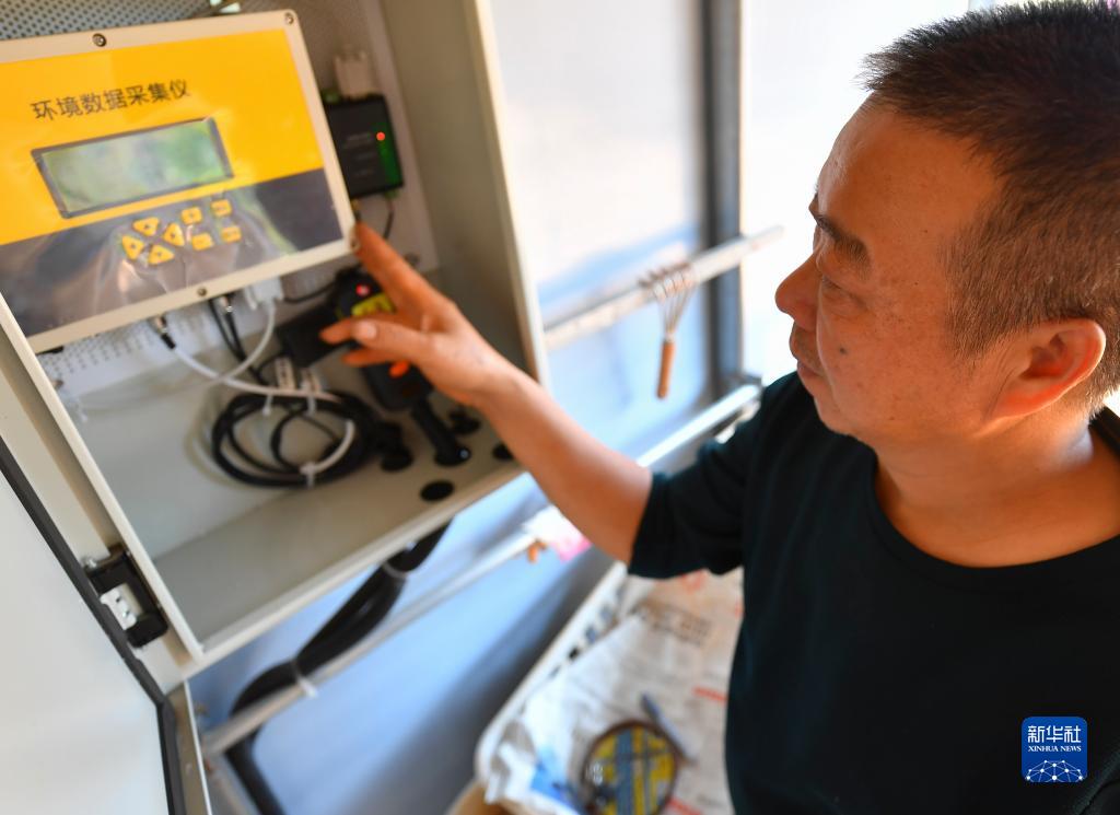 10月18日,在湘潭市雨湖區姜畬鎮泉塘子村,技術(shù)人員在“5G智慧小菇房”查看環(huán)境數據采集儀運行情況。