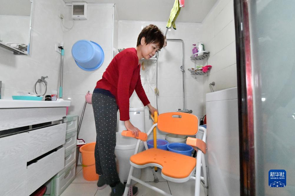10月17日,在天津市河西區尖山街道,居民在家中衛生間內擺放助浴椅、防滑扶手等適老化改造設施。