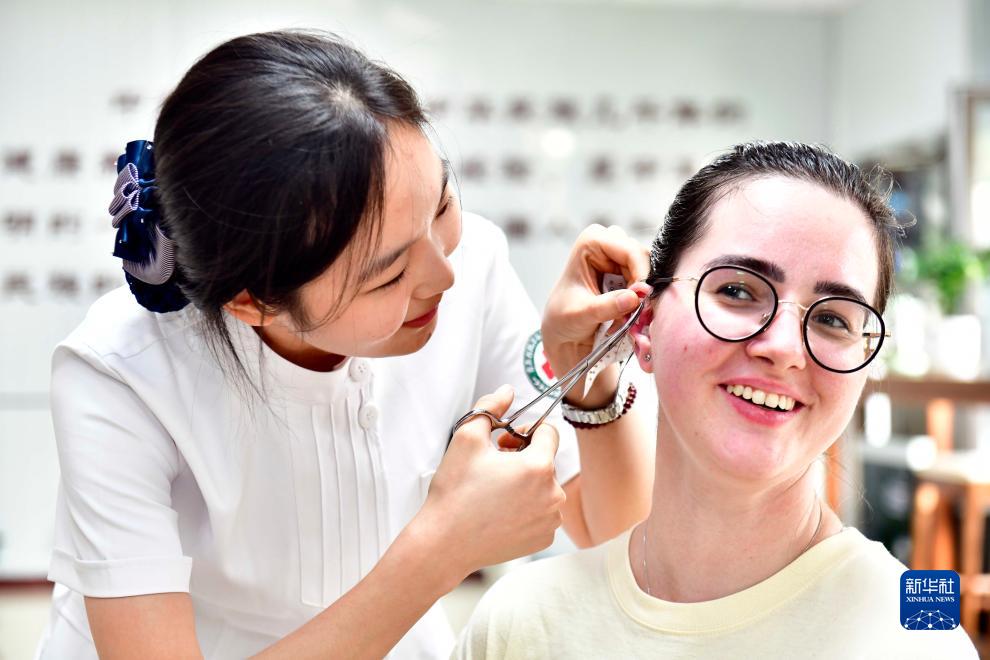 10月18日,在青島西海岸新區中醫醫院,山東科技大學(xué)國際交流學(xué)院斯洛伐克籍留學(xué)生夢(mèng)娜在體驗中醫傳統療法耳穴壓丸。
