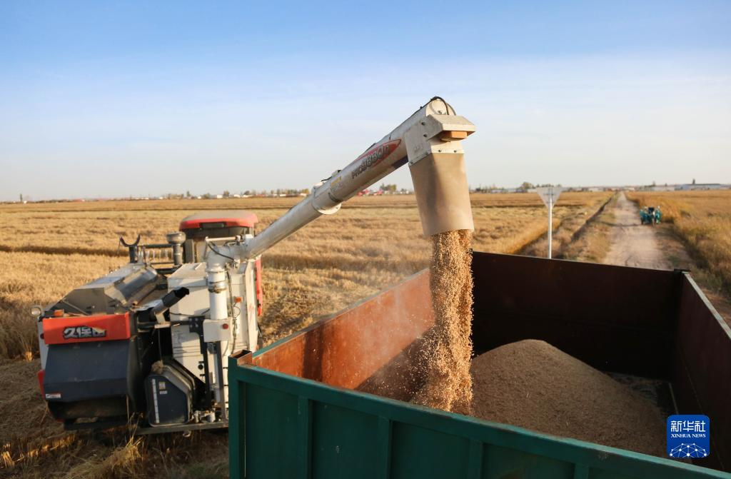 10月18日,在鄂爾多斯市達拉特旗昭君鎮沙圪堵村,農民將水稻裝入運糧車(chē)。