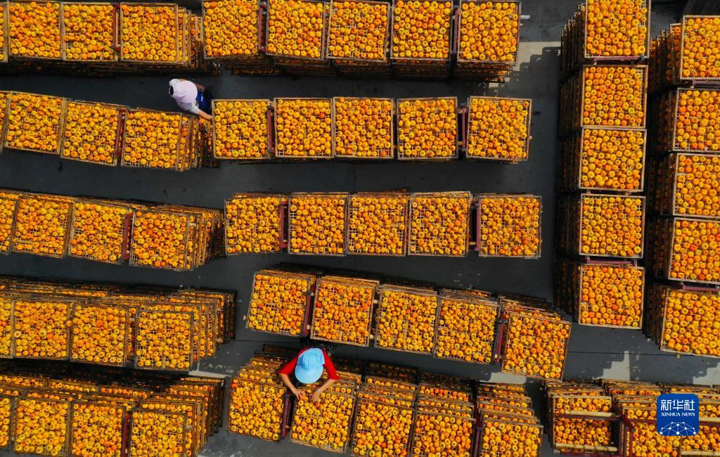 10月18日,在廣西桂林市恭城瑤族自治縣嘉會(huì )鎮泗安村,村民在整理月柿(無(wú)人機照片)。