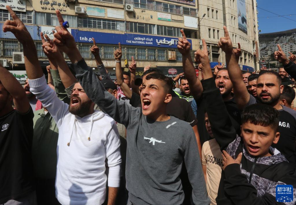 10月18日,在約旦河西岸城市納布盧斯,民眾上街游行抗議加沙醫院遭襲。