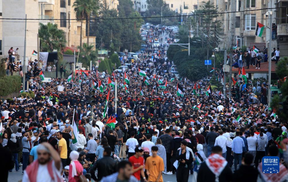 10月18日,人們在約旦安曼的以色列駐約旦大使館附近舉行集會(huì )。