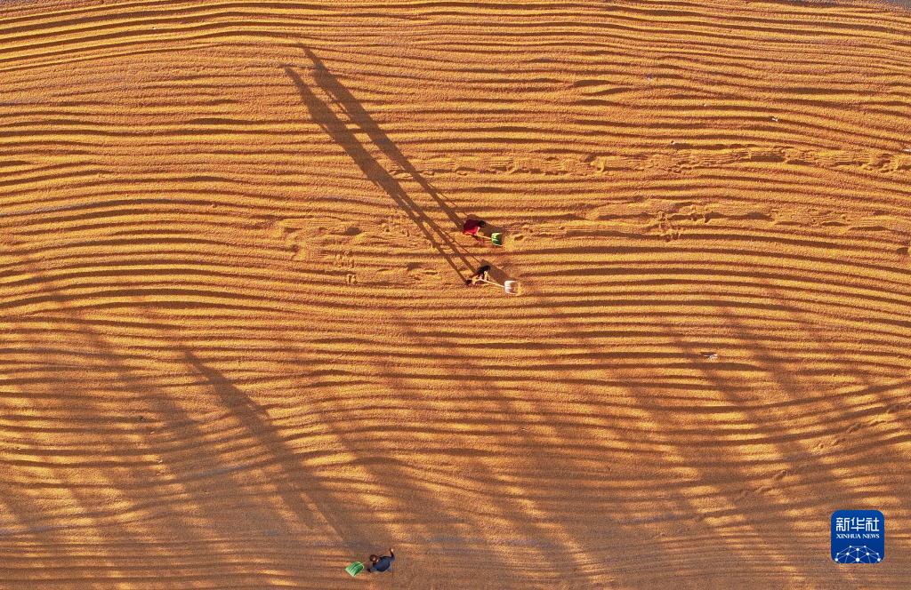 10月16日,唐山市樂(lè )亭縣馬頭營(yíng)鎮的農民在晾曬玉米(無(wú)人機照片)。