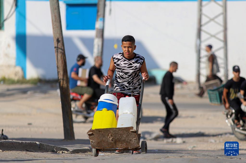 10月18日,在加沙地帶南部城市汗尤尼斯,一名男子運送生活用水。