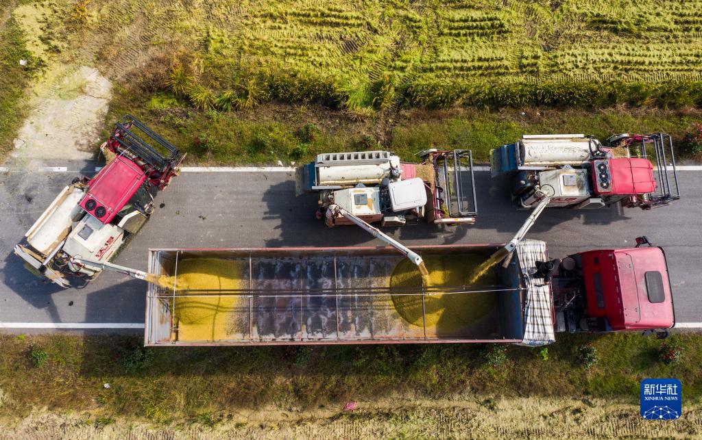 10月19日,收割機在湖州市吳興區東林鎮庵和田連片整治后的1000多畝高標準農田將收獲的稻谷裝車(chē)(無(wú)人機照片)。