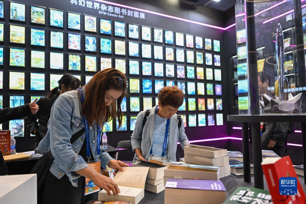 10月18日,觀(guān)眾在2023成都世界科幻大會(huì )主題展覽上挑選科幻書(shū)籍。