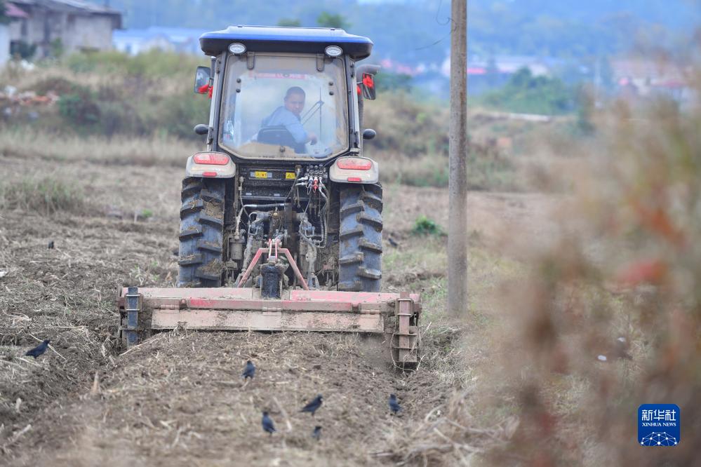10月19日,在湖南省湘潭市雨湖區鶴嶺鎮晶鑫村,農戶(hù)駕駛農機在翻田開(kāi)溝。