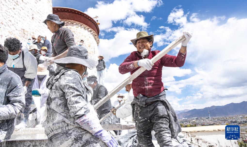 近日,西藏布達拉宮開(kāi)始進(jìn)行粉刷維護工作。為使經(jīng)過(guò)一年日曬雨淋的紅墻白壁保持鮮亮光彩,每年秋冬交替時(shí)節,布達拉宮外墻都要進(jìn)行粉刷“美容”。