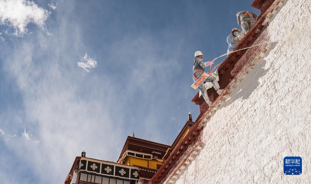 工作人員對布達拉宮外墻噴灑涂料(10月19日攝)。