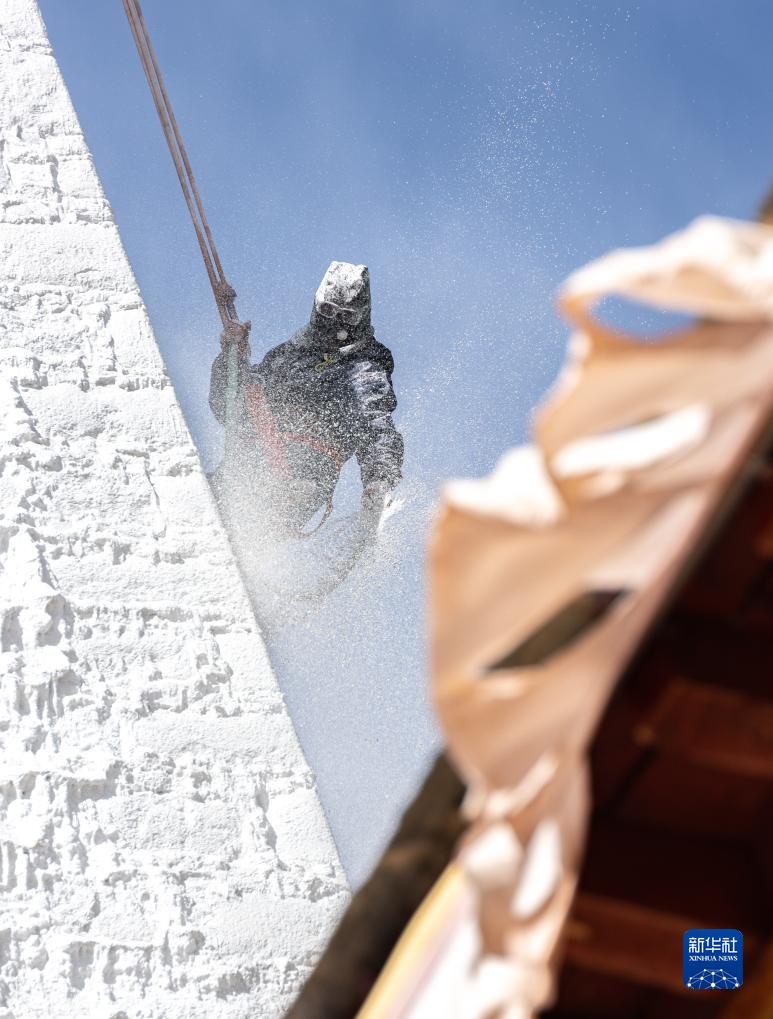 工作人員對布達拉宮外墻噴灑涂料(10月18日攝)。