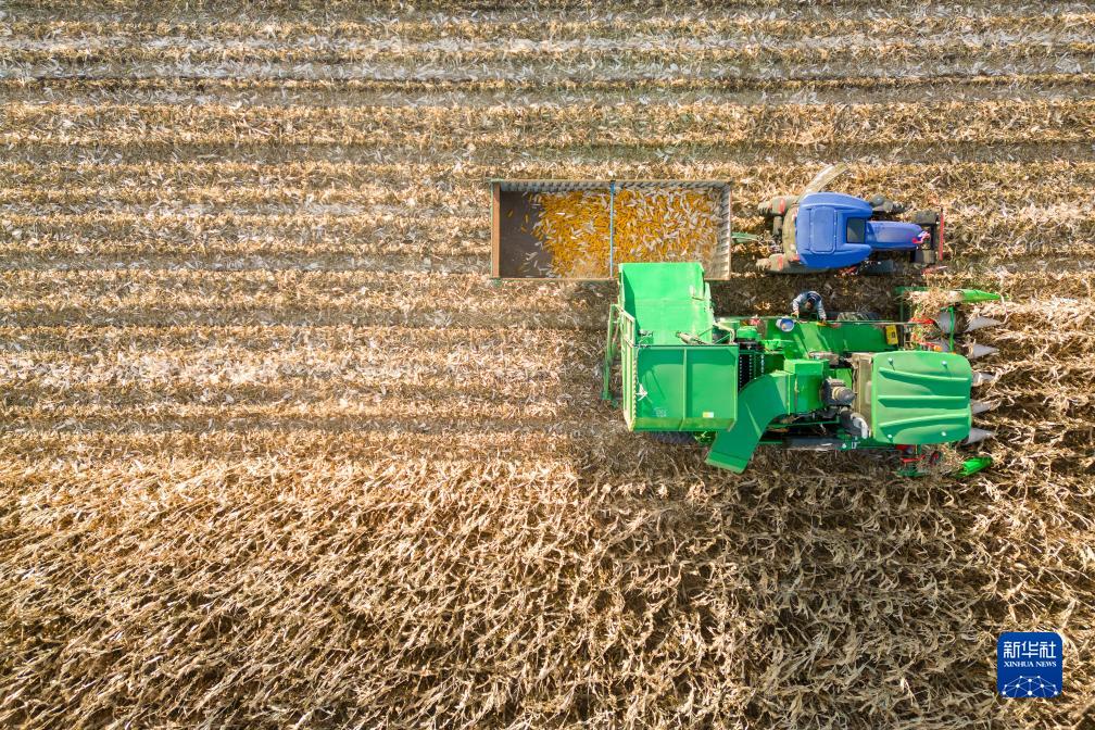 10月19日,收割機在齊齊哈爾市甘南縣中興鄉綠化村的一處玉米地收獲玉米(無(wú)人機照片)。