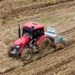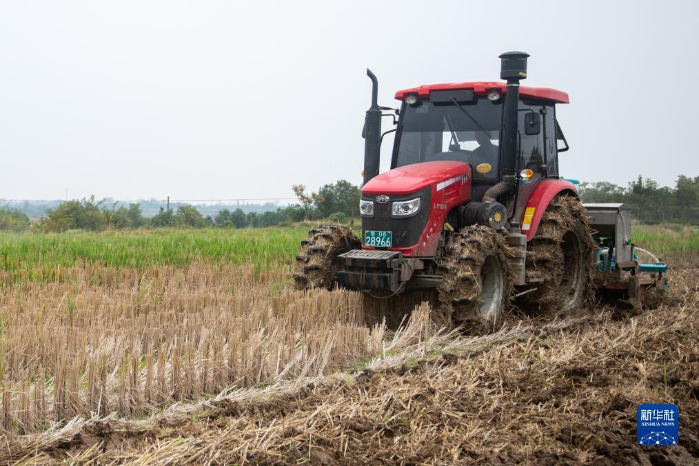 10月19日,在湖北省荊門(mén)市沙洋縣曾集鎮金雞村,五洋農機專(zhuān)業(yè)合作社社員操作機械設備播種油菜。