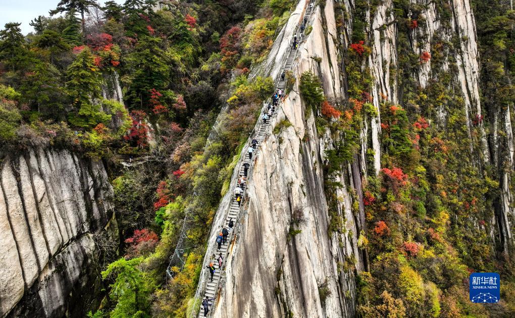 10月19日,游人在攀登華山蒼龍嶺(無(wú)人機照片)。