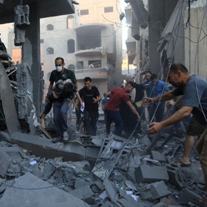 10月19日,在加沙地帶南部城市汗尤尼斯,人們在遭以色列空襲后的建筑廢墟中救援傷者。