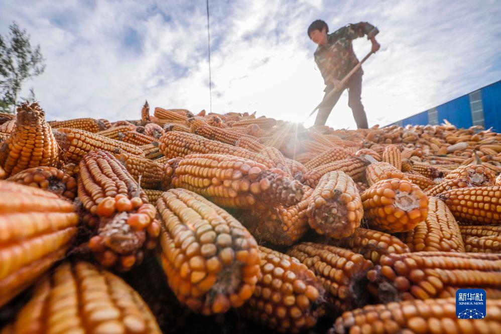 10月19日,河北省遵化市東新莊鎮農民在場(chǎng)院堆放收獲的玉米。