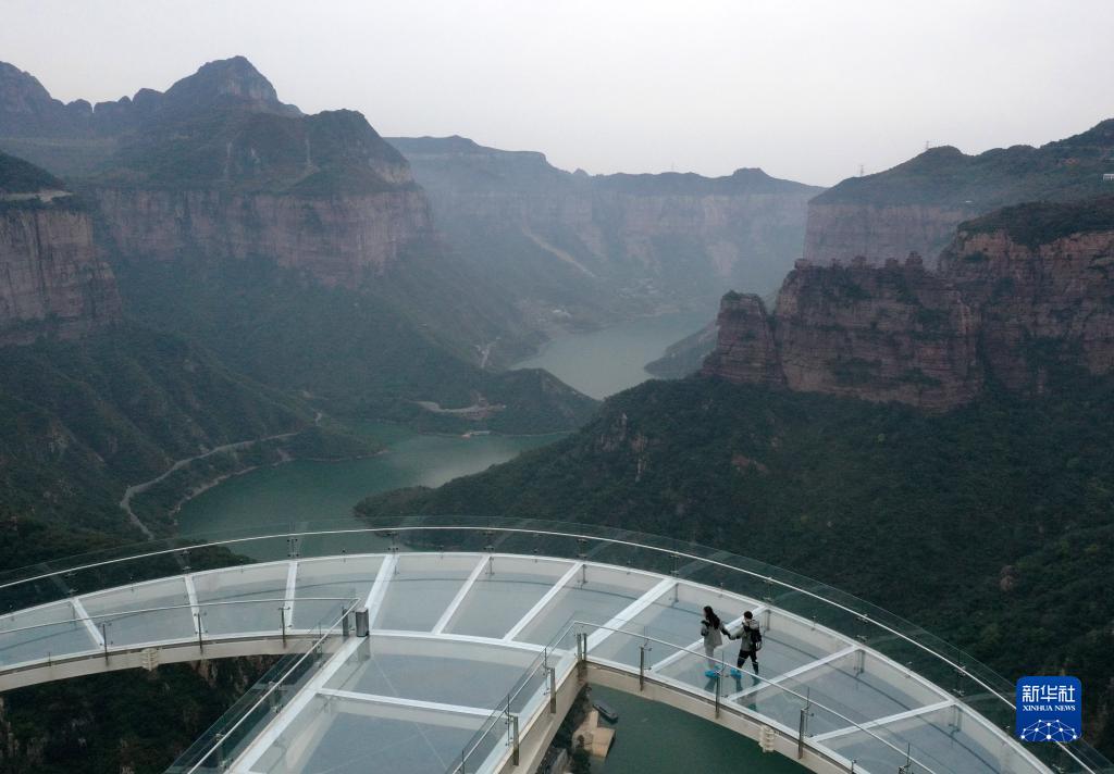 10月19日,游客在河南寶泉旅游度假區的觀(guān)景平臺游玩(無(wú)人機照片)。