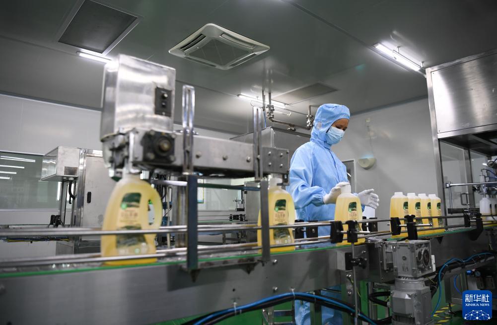 在位于乳源瑤族自治縣的廣東寶華農業(yè)科技股份有限公司車(chē)間內,工作人員在茶油灌裝生產(chǎn)線(xiàn)上(10月19日攝)。
