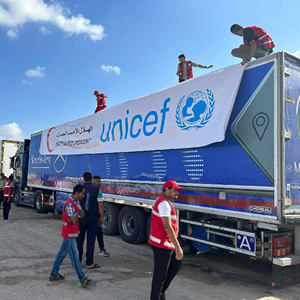 埃及援助人員在拉法口岸附近準備救援卡車(chē)