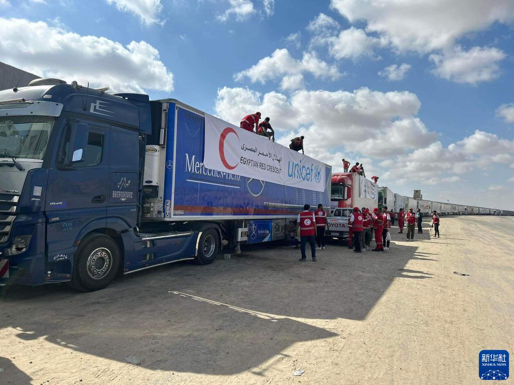 埃及援助人員在拉法口岸附近準備救援卡車(chē)