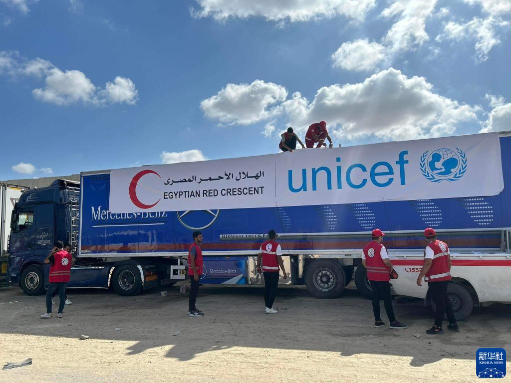 埃及援助人員在拉法口岸附近準備救援卡車(chē)