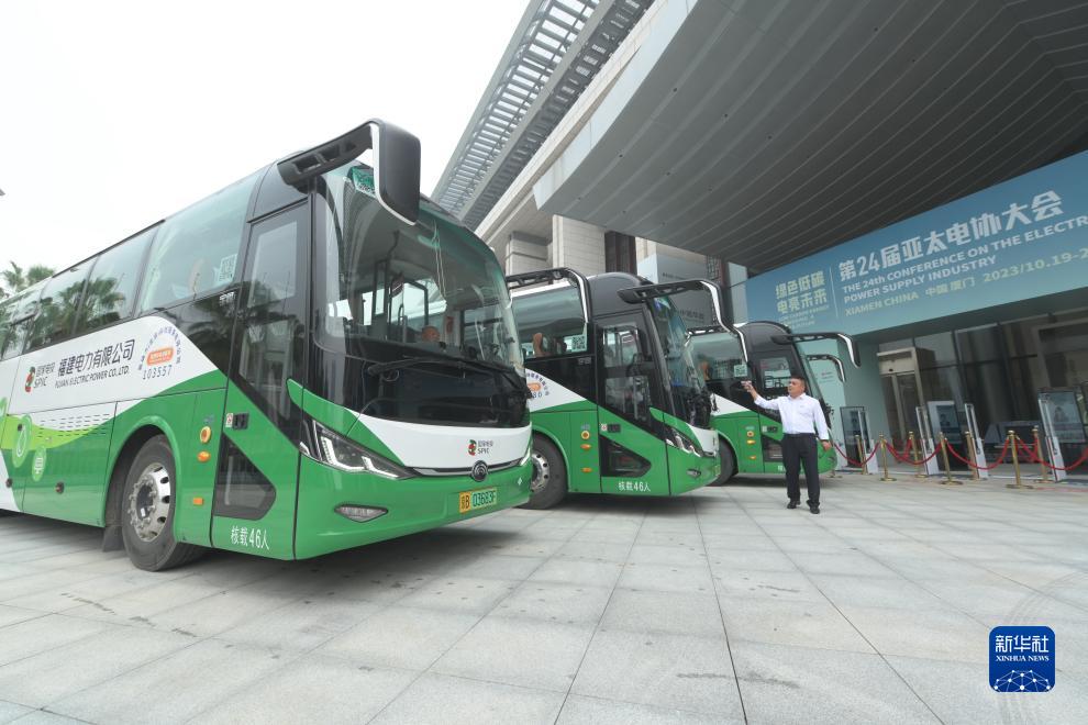 10月20日拍攝的在第24屆亞太電協(xié)大會(huì )展覽會(huì )上展示和供參會(huì )者體驗的氫能大巴車(chē)。