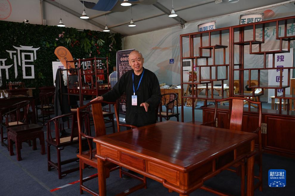 10月21日,手工藝人弓成明在介紹家具。