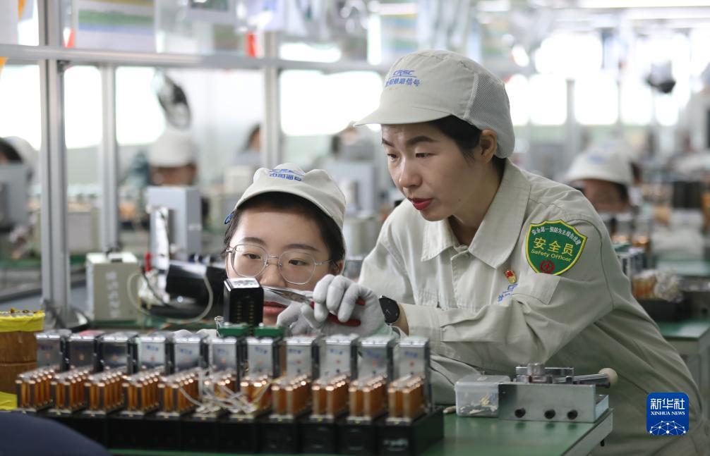 柯曉賓(右)在沈陽(yáng)鐵路信號有限責任公司電器車(chē)間指導班組成員生產(chǎn)繼電器(10月17日攝)。