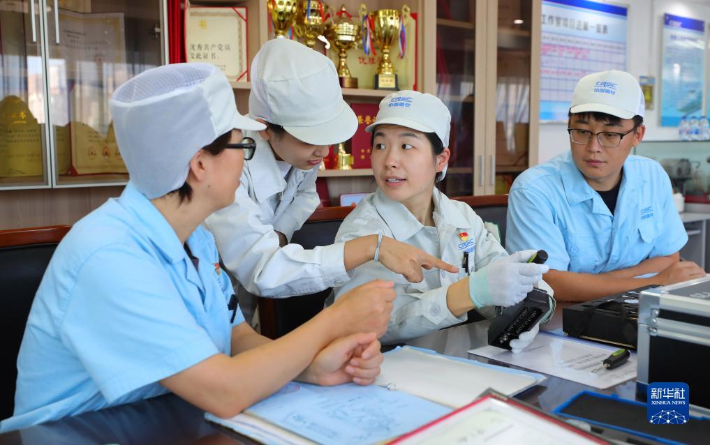 在沈陽(yáng)鐵路信號有限責任公司柯曉賓創(chuàng )新工作室,柯曉賓(右二)和同事探討繼電器調試方法(2022年9月7日攝)。