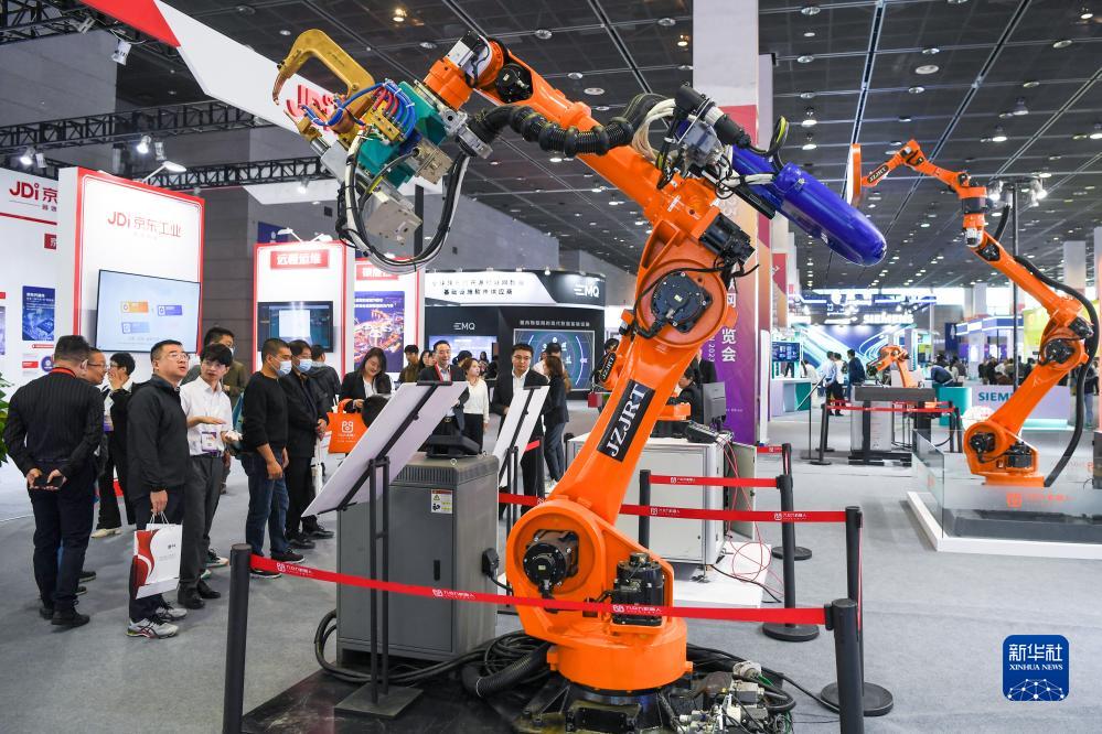 10月21日在2023世界物聯(lián)網(wǎng)博覽會(huì )活動(dòng)現場(chǎng)拍攝的智能機器人工作站。
