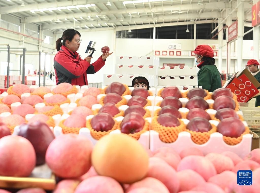 10月20日,工作人員在延安市洛川縣一家果業(yè)企業(yè)直播帶貨。