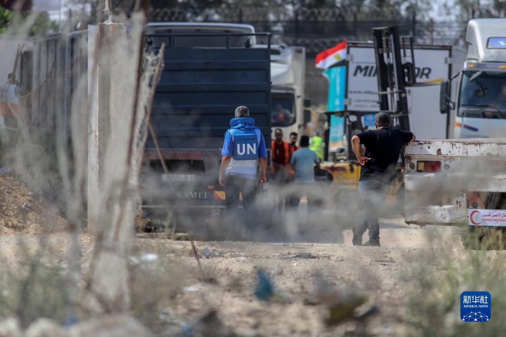 10月21日,工作人員在加沙地帶南部城市拉法卸貨。