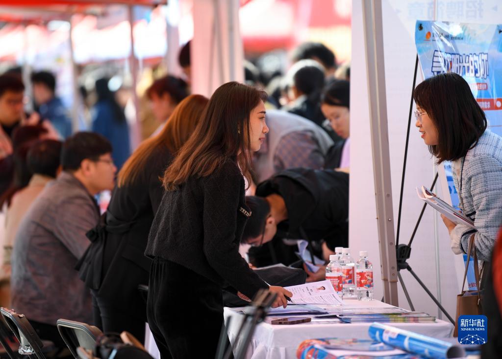 10月21日,高校學(xué)生(右一)在招聘會(huì )現場(chǎng)與用人單位工作人員交流。