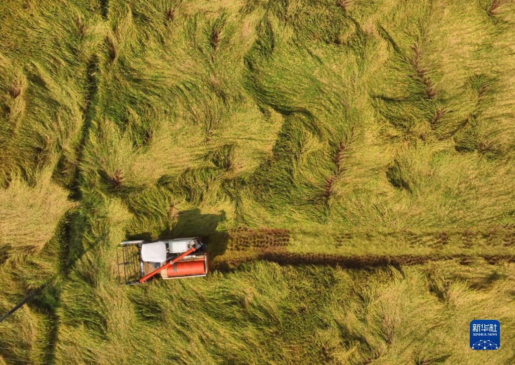 10月21日,在湖南省衡陽(yáng)市祁東縣金橋鎮,當地村民駕駛農機收割晚稻(無(wú)人機照片)。