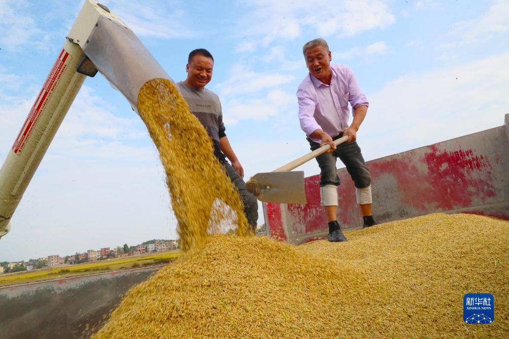 10月21日,在湖南省永州市新田縣三井鎮山下村,村民收獲水稻。