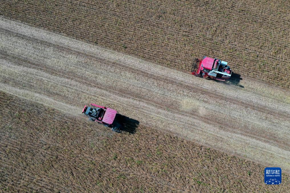 10月21日,在山東省東營(yíng)市廣饒縣稻莊鎮西杜村的田地里,農民駕駛收割機收獲大豆(無(wú)人機照片)。